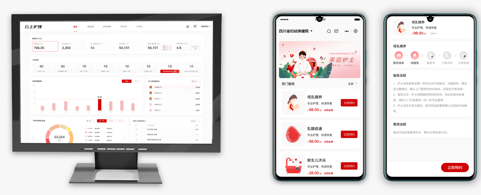智慧护理云平台将“互联网医疗”和“智慧护理”相结合,覆盖APP端、PC端、公众号等多个应用模式,包含云上护理、医联体护理、线上健康管理、患者管理、健康宣教等模块,覆盖护理相关所有互联网线上业务体系,开通线上服务订阅,拓展业务市场,增加医院营收,提告医疗效率和服务质量等同时,提升患者就医体验。