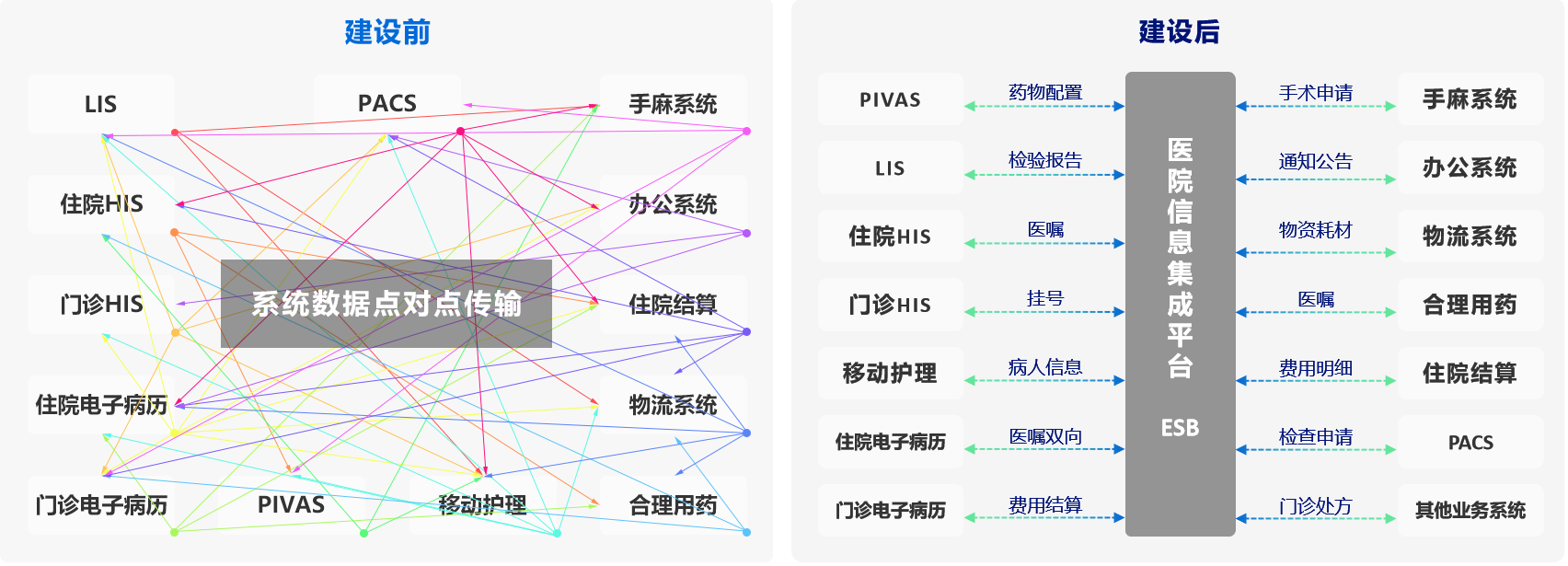 建设前后对比通过建设数据总线ESB集成引擎,从“紧耦合”模式变为“松耦合模式”,实现业务系统集成,打破机构内“信息孤岛”和“信息烟囱”。 |
