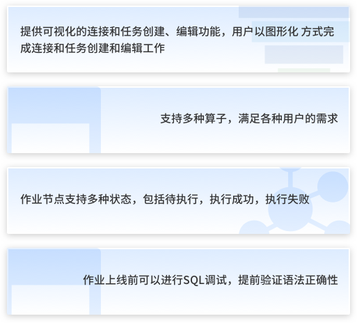 数据开发 提供数据管道、实时计算、多维分析、业务流程、调度运维等数据加工处理端到端的工具集;支持复杂的数据处理模型构建;提供一站式可视化开发与管理界面,支持全托管的作业调度与灵活的调度策略;具有良好的扩展性,支持算子、函数及作业的自定义开发,极大地降低了用户构建数据处理的复杂度,专注于数据价值的挖掘和探索。 |